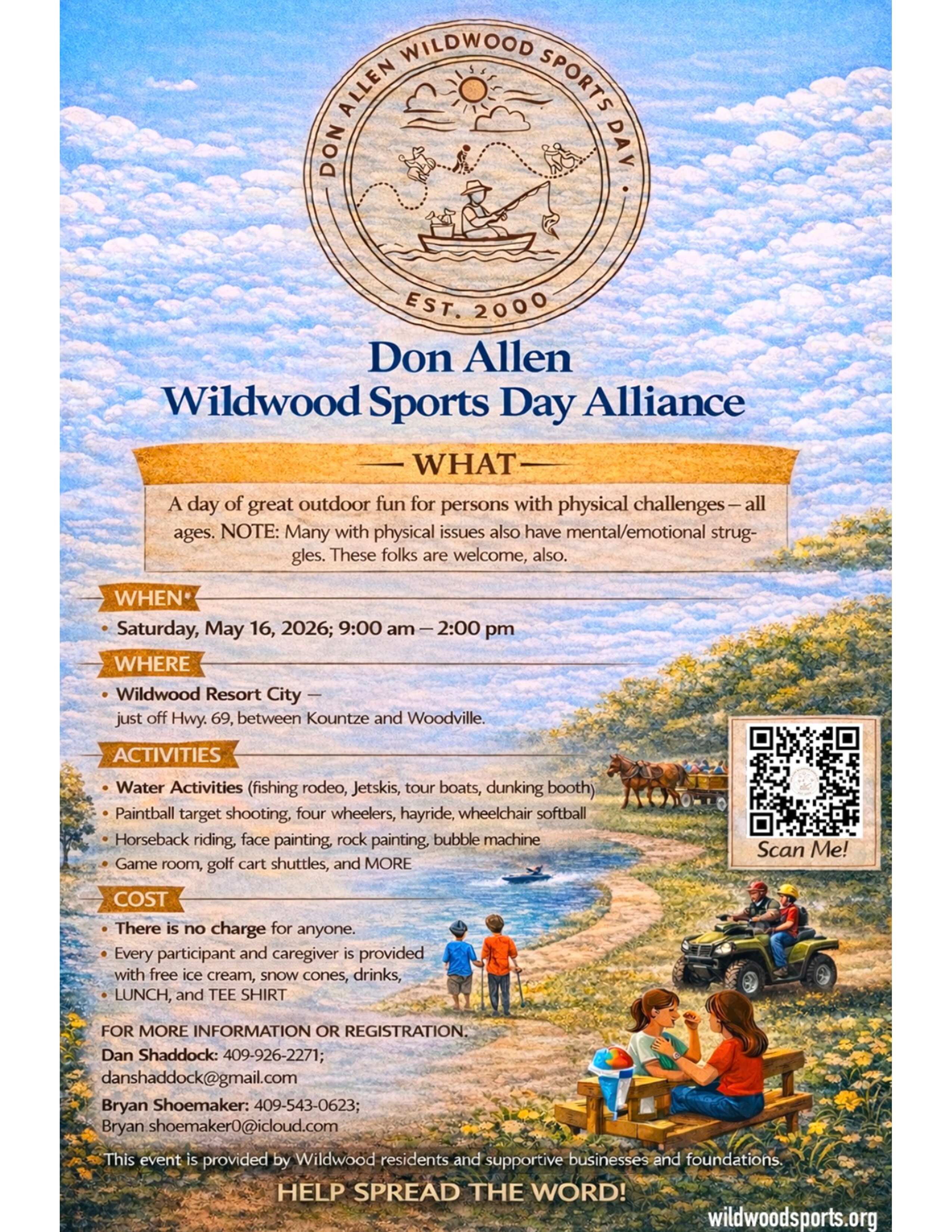 This event is sponsored by caring Southeast Texas businesses and individuals. If you would like to contribute, please make your check out to Don Allen Wildwood Sports Alliance or DAWSA, and mail to PO Box 723 Village Mills, TX 77663. For more information, you may contact Dan Shaddock 409.926.2271 danshaddock@gmail.com or Bryan Shoemaker 409.543.0623 Bryan.shoemaker0@icloud.com